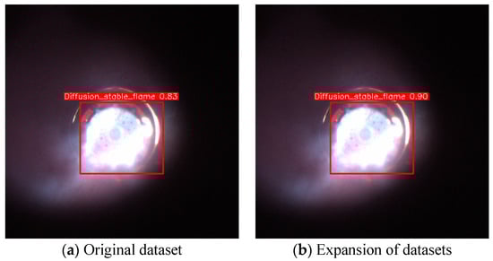 In order to evaluate the generalization ability of the models, we contacted the relevant organizations to obtain some flame data from a boiler at an altitude of 2800 m. These data were used to test two models, the original dataset model and the augmented dataset model. The test results are shown in Figure 13, and both models show high confidence. Especially after data enhancement, the confidence of the models is further improved, indicating that our data enhancement strategy effectively enhances the model’s adaptability and generalization to new environments.