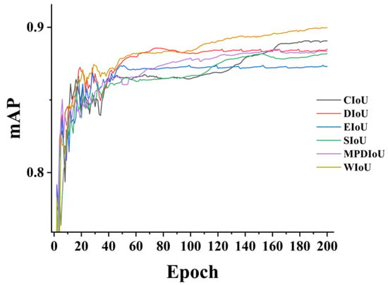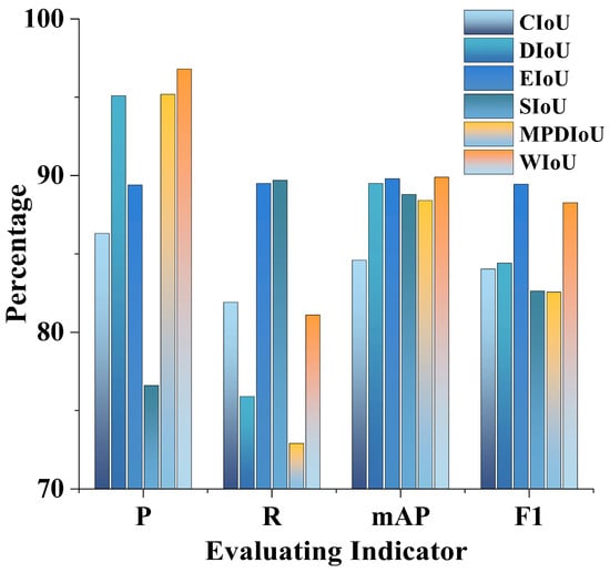 Finally, replacing the loss function with WIoU resulted in a 10.5% increase in overall accuracy and a 5.3% increase in mean average precision, indicating that WIoU enhances the model’s detection accuracy. Figure 14 and Figure 15 illustrate that WIoU surpasses other IoUs in terms of accuracy, mean average precision, and F1 score.