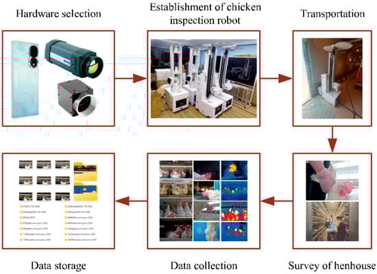 Data collection process. Hardware selection: mobile phones, visible light cameras, infrared thermal imagers, and other peripheral hardware. Establishment of chicken inspection robot: assemble the chicken inspection robot and debug the image acquisition.
