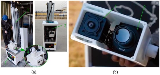Chicken inspection robot. (a) The overall structure of the dead chicken detection robot; (b) Image acquisition device. 1, Lifting device of the chicken inspection robot; 2, information collection and control system; 3, locomotion device [12]; 4, monitoring and image capture device; 5, image capture device—infrared thermal camera; 6, image capture device—visible light camera.
