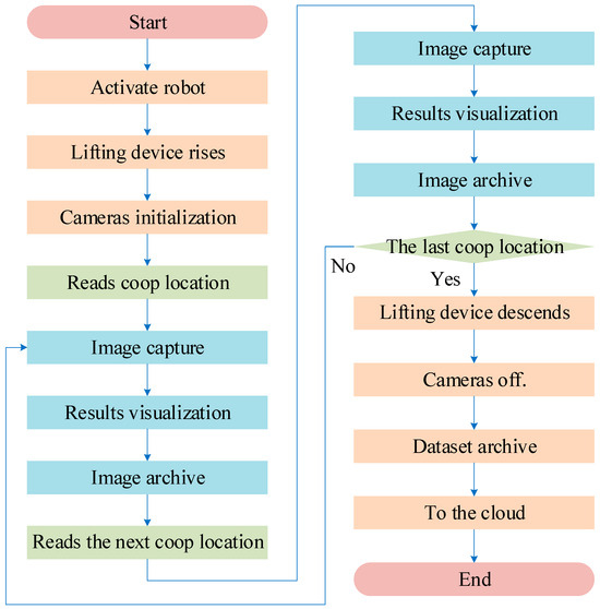 The data collection experimental process is shown in Figure 4. After the poultry house inspection robot is activated, the lifting device equipped with a thermal infrared camera and a visible light camera automatically rises to the predetermined height according to the structure of the poultry house and completes the camera initialization. Subsequently, the robot’s position-reading device reads the cage number while the thermal infrared camera and visible light camera automatically capture images of the hens, continuing until the last cage is completed. The thermal infrared camera and visible light camera are centrally controlled by the information collection system, completing one round of data collection by scanning around 960 cages to obtain diverse data. After the final hen image is captured, the lifting device, thermal infrared camera, and visible light camera reset, and all data are archived by the robot and sent to the cloud.