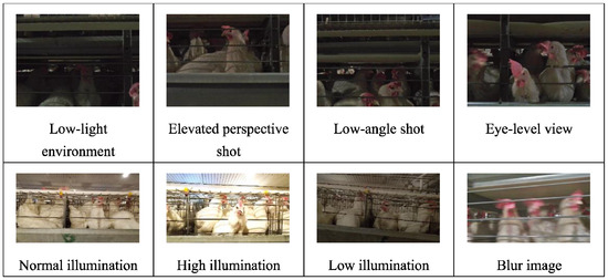 - We collected data on individual laying hens in a natural environment, as illustrated in Figure 6. During photography, complete and partial images of the hens were captured under various natural lighting and background conditions. The data obtained from the natural setting are conducive to analyzing the morphology of free-range laying hens [16] and assessing their health state.