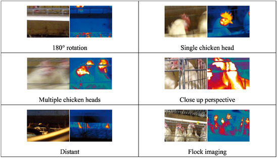 - An innovative image acquisition technology that fuses RGB images with TIR images was introduced [17], as shown in Figure 8. Corresponding RGB and TIR images were taken at different distances, angles, and with varying numbers of hens, capturing multimodal image data. The image fusion technique overcomes interference caused by camera shake in RGB images and provides data support for studying infectious diseases among hen flocks.