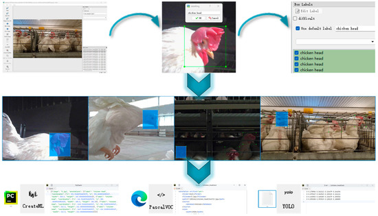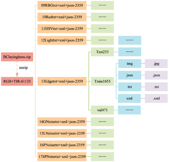 As shown in Figure 9, for the same image, we provide annotation information in three different formats: xml, txt, and json. The xml format annotation files include the images’ size, category, and location information, adhering to the annotation standards of datasets such as PASCAL VOC and YOLO. The txt format is a plain text file containing only category and location information, commonly used for YOLO format annotations, and is characterized by its simplicity and ease of parsing. The json format annotation files include image size, category, location, and other information, with a level of lightness between xml and txt formats. The three data annotation formats we provide can meet the needs of different application scenarios. For the operation guide on data annotation, please refer to https://github.com/maweihong/BClayinghens/blob/main/Data%20Annotation%20Guide.docx (accessed on 1 September 2024).
