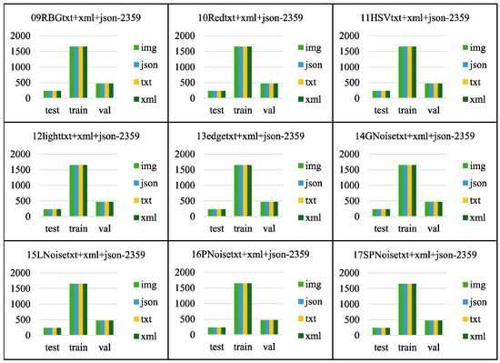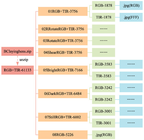The raw images were processed using the methods above, as illustrated in Figure 5. Before data augmentation, there were 30,993 raw images, with 2359 xml, json, and txt data labels each. It is important to note that the laying hen data obtained through the above data augmentation methods include not only the laying hen images but also the corresponding xml, json, and txt data labels for the augmented laying hen images, or the TIR images corresponding to the RGB images. This allows for the support of various model training tasks. After data augmentation, there are 61,133 images and 63,693 data labels (21,231 XML, JSON, and TXT data labels each).