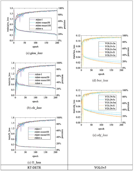 Loss and precision changes of RT-DETR and YOLOv5 chicken head detection models. (a) giou_loss; (b) cls_loss; (c) l1_loss; (d) box_loss; (e) obj_loss.