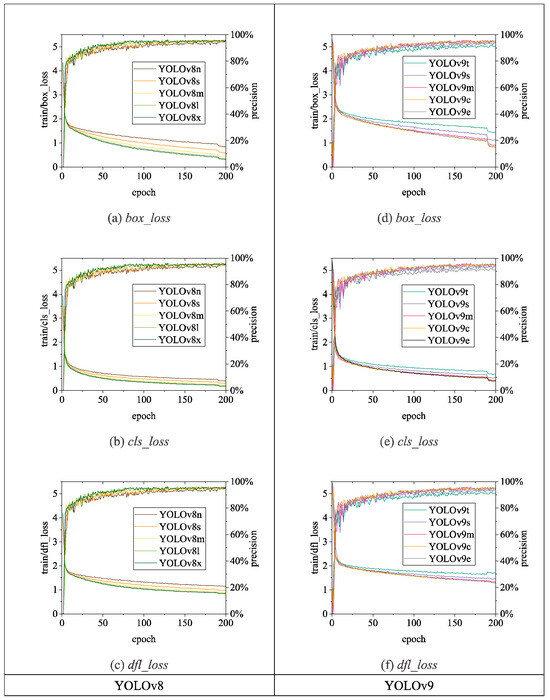 Overall, as the number of training epochs increases, the loss values for each algorithm gradually decrease and stabilize, while the precision values gradually increase and stabilize. The highest convergence of the loss values among the algorithms reaches 0.02. For detection tasks where precision is prioritized, selecting one of the following seven algorithms—YOLOv5m, YOLOv5l, YOLOv5x, YOLOv9m, YOLOv9c, YOLOv9t, or YOLOv10l—can achieve the highest precision of 0.96.