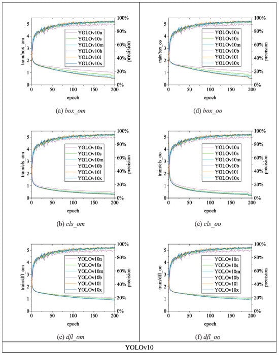 Figure 17 displays the loss and precision curves for the YOLOv10 series algorithms. Both the one-to-many head (om) and one-to-one head (oo) variants of the YOLOv10 series show convergent loss curves. YOLOv10l achieves the lowest values for box_om, cls_om, and dfl_om, which are 0.48, 0.25, and 0.89, respectively. YOLOv10l also has the lowest values for box_oo, cls_oo, and dfl_oo among the YOLOv10 series algorithms, with values of 0.50, 0.18, and 0.90. Additionally, YOLOv10l achieves the highest precision in this series, at 0.96. Therefore, when applying the BClayinghens dataset with the YOLOv10 series algorithms, using YOLOv10l will yield better detection precision.