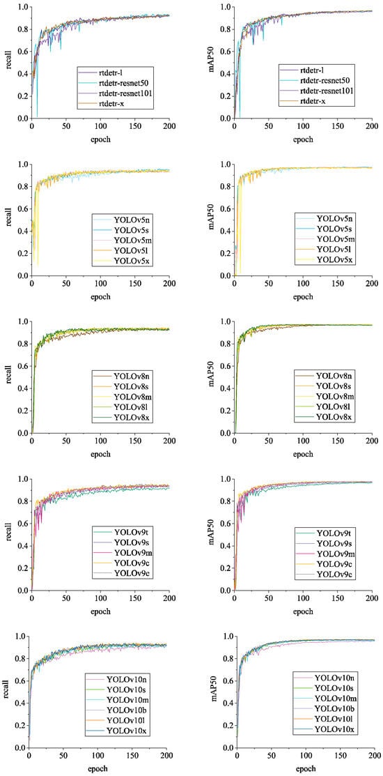Additionally, this study evaluates the detection performance of each model using Recall and mAP50 (mean Average Precision at Intersection over Union of 0.5), as shown in Figure 18. It can be observed that, with the exception of the RT-DETR-ResNet50 and YOLOv5x algorithms, the Recall and mAP50 values of the other algorithms converge rapidly in the early stages of training and exhibit minimal oscillation.