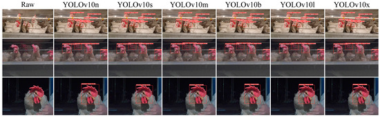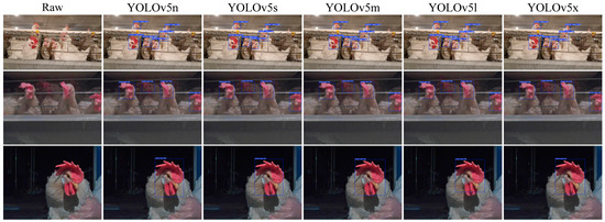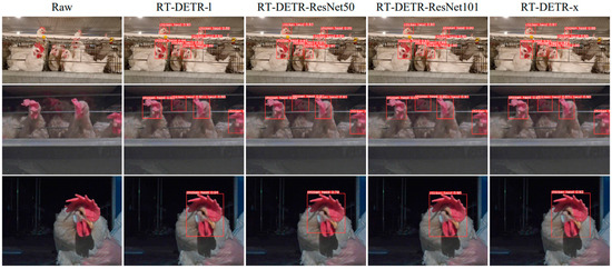 Due to the interpretability limitations of deep learning algorithms, we conducted a visual analysis using the inference results of chicken head detection. Figure 19, Figure 20, Figure 21, Figure 22 and Figure 23 demonstrate the recognition effects of different object detection algorithms on laying hen images. In Figure 19, the highest confidence for chicken head detection by the RT-DETR series algorithms is 0.95. In Figure 20, the highest confidence for chicken head detection by the YOLOv5 series algorithms is 0.98. In Figure 21, the highest confidence for chicken head detection by the YOLOv8 series algorithms is 0.98. In Figure 22, the highest confidence for chicken head detection by the YOLOv9 series algorithms is 0.98. In Figure 23, the highest confidence for chicken head detection by the YOLOv10 series algorithms is 0.99.