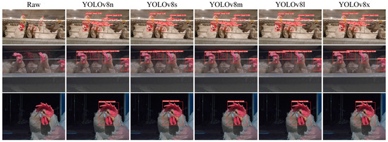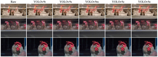 Figure 16 illustrates the variations in loss values and precision for the YOLOv8 and YOLOv9 chicken head detection models. Among the YOLOv8 series models, the largest model, YOLOv8x, achieves the lowest loss values, with box_loss converging to 0.31, cls_loss converging to 0.18, and dfl_loss converging to 0.84. In contrast, the smallest model in the YOLOv8 series, YOLOv8n, has box_loss, cls_loss, and dfl_loss values of 0.84, 0.40, and 1.15, respectively. We observe that the loss curves for the YOLOv8 series algorithms converge better as the model size increases. Additionally, precision exhibits a similar trend, with YOLOv8n having the lowest precision among the YOLOv8 series models, at 0.95.