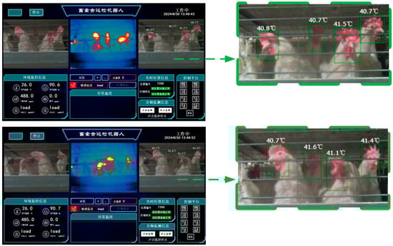 When the detection and recognition results of the chicken head are accurate, the chicken inspection robot in the henhouse can call the temperature detection algorithm to calculate the chicken head temperature. Since the RT-DETR above and YOLO series object detection algorithms can accurately identify the chicken head targets, the effect of chicken head temperature recognition is only related to the temperature recognition system. The YOLOv5n algorithm, which has the highest sensitivity for chicken head detection in the YOLOv5 series, was deployed on the chicken inspection robot in the henhouse to test the effect of chicken head temperature detection. The YOLOv5n algorithm can maintain a fast speed while providing accuracy suitable for edge devices, and the effect of chicken head temperature recognition is shown in Figure 24.