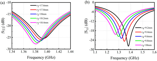 The reflectance spectra of the patch antenna sensor with (a) different radii of the outer CSRR, and (b) different radii of the inner CSRR.