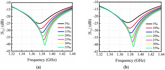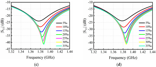 To validate the performance of the proposed patch-antenna-based microwave sensor for salt concentration measurement of NaCl solution, reflectance spectra were simulated with salt concentration changes at different ambient temperatures, 10 °C, 15 °C, 20 °C, and 25 °C, as shown in Figure 3a–d, respectively. The simulated salt concentration ranged from 5‰ to 35‰, resulting in a resonant frequency ranging from 1.37 to 1.38 GHz. It was found that the resonant frequency significantly increased with the increase in salt concentration at a fixed ambient temperature. With the increase in the salt concentration, the dielectric constant of the NaCl solution declined, resulting in less electric and/or magnetic energy stored. As a result, the resonant frequency moved to a higher frequency. Hence, once the resonant frequency was measured, we could obtain the salt concentration at a fixed ambient temperature.