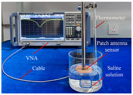 To validate the performance of the designed patch antenna as a microwave sensor for salt concentration sensing, a protype was fabricated and tested. Photos of the fabricated patch antenna sensor are shown in Figure 4, where a smaller copper disc is attached on the top side of the FR-4 substrate, as shown in Figure 4a, and a larger copper disc integrated with two CSRRs is fabricated on the bottom side of the FR-4 substrate. Next, the resonant frequency was measured by using a Vector Network Analyzer (VNA), R&S ZNBT40, Germany, where only the top disc radiator was immersed in the NaCl solution under testing. The experimental setup is shown in Figure 5, where NaCl solutions with salt concentrations at 5‰, 10‰, 15‰, 20‰, 25‰, 30‰, and 35‰ have been prepared. The experimental measurements were conducted at an ambient temperature of 25 °C. In order to minimize experimental errors, the measurements were repeated six times for each sample.