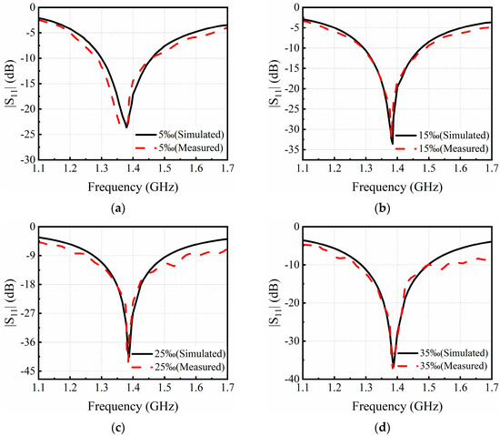 Measured and simulated reflectance spectra of the patch antenna sensor immersed in saline solutions of (a) 5‰, (b) 15‰, (c) 25‰, and (d) 35‰.