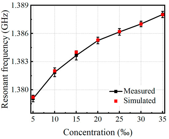 The measured and simulated reflectance spectra of the patch antenna microwave sensor for one of the measurements are plotted in Figure 6a–d with salt concentrations at 5‰, 15‰, 25‰, and 35‰, respectively. The measured resonance frequencies have good agreement with the simulated ones, indicating that the protype can acquire the accurate salt concentration of NaCl solution once it is calibrated by the simulation. When a large number of NaCl solutions are simulated or measured, the relationship between the resonant frequency and salt concentration can be obtained, as shown in Figure 7. The error bars indicate the standard deviation from the averaged amplitude values, and the absolute error of the measurement is less than 0.3%. The error is random and mainly caused by the influence of ambient temperature and operational differences in measurement. From Figure 7, it can also be found that the resonant frequency non-linearly increases with the increase in salt concentration.