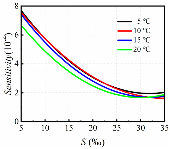 It has been proven that the dielectric constant varies slowly with the increase in salt concentration [36]. Hence, the proposed patch-antenna-based microwave sensor is suitable for salt concentration sensing of NaCl solution. The sensitivity of the proposed microwave sensor at different ambient temperatures was investigated, as shown in Figure 8. It can be seen that the sensitivity tended to decrease with the increase in the salt concentration at a fixed ambient temperature. Once the salt concentration was greater than 20‰, the sensitivity stabilized or decreased very slowly. However, it should be pointed out that the sensitivity varied slightly with the variation in the ambient temperature, as shown in Figure 8.