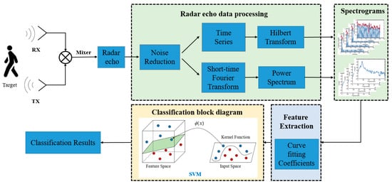To sum up, neither of the algorithms based on feature extraction and time-frequency differences can achieve accurate classification, which is caused by the insufficient utilization of micro-Doppler features. To address this issue and to accurately classify pedestrians and cyclists, a curve-fitting architecture based on the micro-Doppler effect is designed for this research. Firstly, in radar echo data processing, wavelet thresholding and short-time Fourier transforming are integrated to ameliorate the loss of feature information caused by the high similarity among objects. Subsequently, to enhance the classification capability and robustness of the model, a polynomial fitting module based on scoring was designed in the research, which enhances the model’s sensitivity to the micro-Doppler spectrogram complexity. Finally, to address the issues of the limitations of micro-Doppler feature extraction and the inadequate utilization of micro-motion characteristics, instead of neural networks, SVM is integrated into the algorithm framework to reduce the latency, and the model performance is optimized based on real-world scenario data.