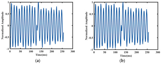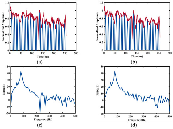 The amplitude of is the envelope of the signal , which is described in Equation (4). It shows that the amplitude of the Fourier transform of real functions is symmetric. Therefore, this paper only investigates the measurements with a y-axis greater than 0 and extracts the time-domain normalized signal envelope as depicted in Figure 4a,b.