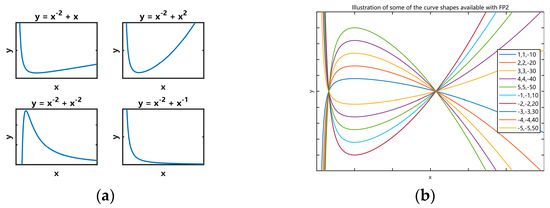 Fractional polynomials with offer many potential improvements in fit compared with conventional polynomials, although the family is often useful, but is much richer. It shows that the curves representing can assume four basic shapes, depending on the sign of and on whether and have the same or different sign. Figure 5a shows examples of the four shapes chosen from the variety available with only one value of (−2) and four values of (±1, ±2).