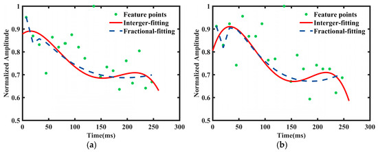 In order to thoroughly validate the flexibility of fitting fractional polynomials, we utilize the same power terms to fit the same set of data and introduce the residual sum of squares for comparative analysis. The selection of power terms requires empirical judgment, with the guiding principle being to ensure that the fitting curve closely adheres to the experimental data while minimizing the deviation of the fitted data as much as possible, and it must meet the accuracy requirements for fitting time-frequency domain data. Based on the aforementioned selection criteria, we deliberately selected the most representative schemes of integer polynomial power terms in terms of flexibility and computational speed, namely the 4th and 5th orders, to better contrast the fitting characteristics of integer and fractional polynomials. Within this range, computation is faster, storage space is smaller, and stability is relatively higher. Doing so, the power terms of the integer polynomials selected in the time domain are as follows: