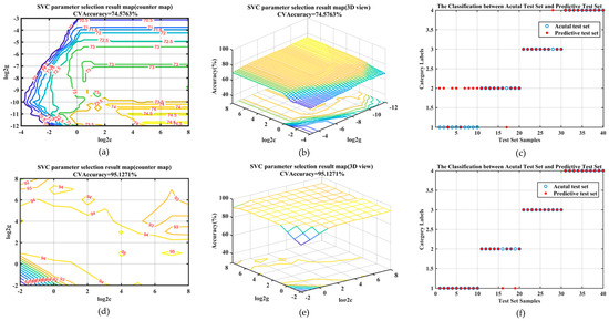 As shown in Figure 8a,d, the process of 3-fold cross-validation for parameter optimization on the training set is shown, followed by a grid search to determine the optimal classification accuracy. Figure 8b,e displays the projection of the CV accuracy from Figure 8a,d onto the penalty parameter and RBF kernel function plane. To classify the test set in both time and frequency domains, the and parameters corresponding to the highest average classification accuracy were selected. Consequentially, the classification results on the test set are shown in Figure 8c,f, where all 40 test samples in the time-frequency domain have only 30 correct, while 38 of the 40 groups are in the frequency domain. In order to be subject to certain influences in the process of classification, we propose a random approach during the training of samples to mitigate experimental randomness.