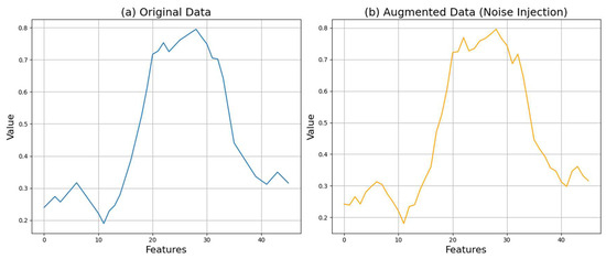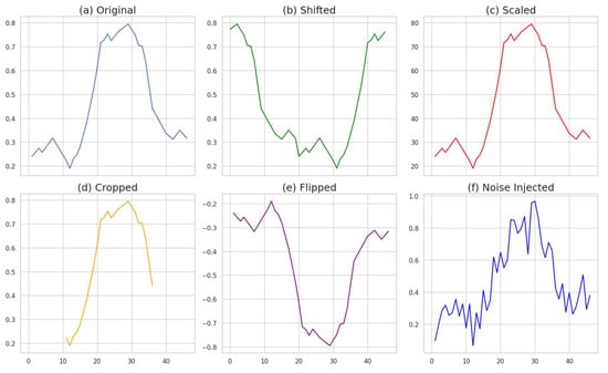 Noise injection is a data augmentation technique that generates new data by adding random noise to the original time series data. Noise injection helps models learn robustly despite noise in the data, ensuring stable operation even with noisy data. Magklaras et al. [16] demonstrated that noise injection can protect the integrity of time series data and enable the detection of malicious data by accessing data validity using statistical analysis and machine learning algorithms at the receiving end. Thus, data augmentation techniques, particularly noise injection, play a crucial role in improving the classification performance of time series data. This paper aims to enhance the classification performance of time series data by leveraging these techniques. Figure 1 shows the application of five data augmentation methods, namely, shifting, scaling, cropping, flipping, and noise injection; (a) shows the original data, (b) displays the result of shifting, (c) depicts scaling, (d) demonstrates cropping, (e) presents flipping, and (f) exhibits the result of noise injection.