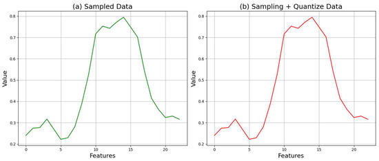 Quantization is the process of converting the amplitude values of sampled discrete signals into digital values by dividing them into fixed levels. In this paper, 16-bit quantization is used to convert the signals into digital values. The 16-bit quantization uses 65,536 (216) distinct values to represent the signal amplitude, which allows for sufficient detail representation of the signal while efficiently managing data size [31]. The quantization process is designed to minimize quantization noise. Figure 5 shows the application of the quantization process to the crop data after the sampling process.