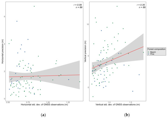 | Horizontal accuracy | Deciduous | 17.62 | No. of satellites (16%), No. of trees in a 10 m radius (15%), No. of trees in an 8 m radius (13%), NDVI (11%) |