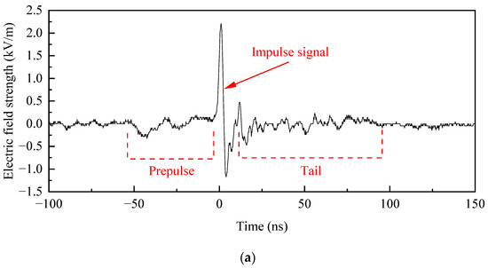 In order to ensure the continuous operational stability of the device and minimize electromagnetic pollution, a single-shot emission mode of the pulse source is used during the ground-based testing experiment, with a charging voltage of 50 kV and a measurement distance of 400 m. The specified sensor described in Section 2.6 is employed for conducting the experiment. As shown in Figure 17a, the main pulse waveform exhibits clear bipolar features, with a rise time of 1.9 ns, a pulse half-width of 2.5 ns, a peak field strength of 2.2 kV/m, a peak-to-peak field strength of 3.4 kV/m, and an effective voltage of 880 kV. Furthermore, an initial pre-pulse of about 53 ns duration is detected prior to the impulse signal, which is attributed to the backward radiation effect of the feed antenna. After performing a Fast Fourier Transform (FFT) on the time-domain waveform, we obtained the frequency spectrum of the signal, as shown in Figure 17b. This spectrum exhibits a central frequency of 94 MHz, with a 10 dB bandwidth spanning from 8 to 205 MHz. The relative bandwidth is calculated at 185%, and the in-band energy constitutes 91%. The spectral distribution of the signal aligns with the standard characteristics of VHF ultra-wideband signals. Due to the capacitor charging voltage being set at only 50 kV during testing (the maximum value can reach 100 kV), there is significant room for increasing the effective voltage of the electromagnetic pulse signal radiated by the system at full power.