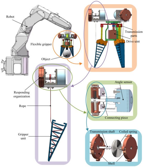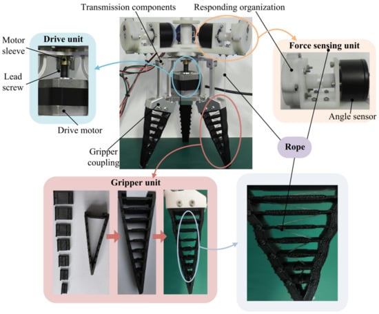 In this paper, a rope-driven force sensing flexible gripper is designed, as shown in Figure 1 and Figure 2, which is mainly composed of a driving unit, a transmission parts, a gripper unit, and a force sensing unit. Among them, the drive unit has a lead screw; the lead screw is installed with a threaded motor sleeve; the motor sleeve and the transmission parts are a fixed connection; the force sensing unit is mainly composed of an angle sensor, a connecting piece, and a responding organization; and the responding organization includes a transmission shaft, a shell, and a coiled spring. The force sensing unit is installed and fixed at the end of the flexible gripper, and the force sensing unit and the gripper unit are connected by rope.