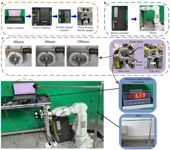 In order to verify the grasping contact force sensing function of the rope-driven force sensing flexible gripper, the experimental system of the rope-driven force sensing flexible gripper is set up as shown in Figure 6. The experimental system includes a robot, the rope-driven force sensing flexible gripper, and an object to be grasped. The robot uses a 6-DOF industrial robot, while the gripper unit is composed of seven removable crossbeams of the rope-driven force sensing flexible gripper, which is made of a flexible TPU material with good linear elasticity through 3D printing. The stepping motor is used as the driving unit to realize the opening and closing action of the rope-driven force sensing flexible gripper. The force sensing unit is made of a 3D printed resin material, and includes a angle sensor (GRM, produced by Wheel Technology (Dongguan) Co., LTD, Dongguan, China)and responsive architecture with a coiled spring to realize the reset of the angle sensor, while the flexible gripper is connected with the force sensing unit through a rope. In order to compare and verify the grasping contact force of the rope-driven force sensing flexible gripper, a grasping object simulation device with integrated force sensor is designed, and the actual grasping contact force can be obtained at the same time during the grasping process. In this paper, force sensor (HZC-MS3, produced by Bengbu Chengying sensor Co., LTD, Bengbu, China) and digital display instrument (MCK-Z-I, produced by Bengbu Chengying sensor Co., LTD, Bengbu, China) were used. The sensor was placed in a shell made by 3D printing. During grasping, three gripper units grasped the shell, and the sensor in the shell was aligned with the gripper unit to measure the grasping force. The MCU with STM32F103 chip (produced by Shenzhen Puzhong Technology Co., LTD, Shenzhen, China) as the core was used as the lower computer to build the control system, and QT was used to build the upper computer for control and data display.