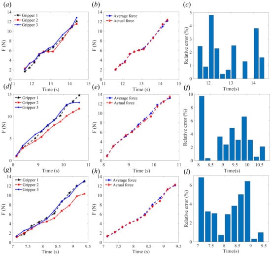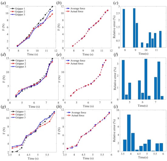 As shown in Figure 7, the rope-driven force sensing flexible gripper to grasp objects of 80mm diameter at node 11, node 13, and node 14, respectively. Figure 7a shows the force sensing results of the three gripper units when grasping the object at contact node 11, while Figure 7b shows the comparison between the average force of the three gripper units and the actual force, and Figure 7c shows the relative error between the average force of the three gripper units and the actual force. Figure 7d–f show the results of the three gripper units grasping the object at node 13, Figure 7g–i show the results of the three gripper units grasping the object at node 14. It can be seen that in the initial stage of the grasp, the relative error is large while the absolute error is small, while in the end stage of the grasp, the absolute error is large but the relative error is small. The effect of force sensing in the middle stage is better than in the initial stage and the end stage when the rope-driven force sensing flexible gripper performs force sensing.