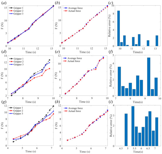 Experimental test results (diameter 100 mm): (a) grasping force of node 11; (b) average force compared with actual force of node 11; (c) relative error of grasping force of node 11; (d) grasping force of node 13; (e) average force compared with actual force of node 13; (f) relative error of grasping force of node 13; (g) grasping force of node 14; (h) average force compared with actual force of node 14; (i) relative error of grasping force of node 14.