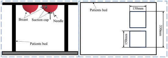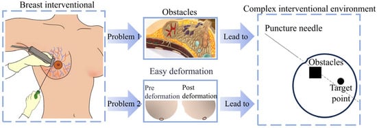 Global cancer statistics released by the International Agency for Research on Cancer (IARC) of the World Health Organization show that breast cancer accounts for as many as 2.3 million people in the female population, surpassing lung cancer as the number one cancer afflicting women [1,2]. Early acceptance of breast cancer treatment by patients can increase the cure rate and improve the prognosis. Minimally invasive interventions are one of the most common surgical procedures for breast cancer diagnosis and treatment, such as breast biopsy, radioactive particle implantation, and ablation therapy [3]. Minimally invasive interventional diagnosis and treatment uses a needle to remove tissue samples for diagnosis and to intervene at the target point inside the tissue for treatment. If the needle tip deviates during this process, it will lead to misdiagnosis or tissue damage. Therefore, ensuring that the needle tip accurately pierces the target point is the key to interventional surgery. Because of the high mobility and easy deformation of breast tissue, the target point may deviate from the original position, and the blood vessels and nerves inside the breast tissue may also hinder the ideal needle path, complicating the interventional environment [4], as shown in Figure 1.