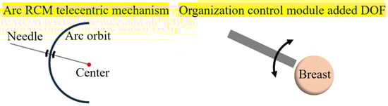 In actual clinical surgery, surgeons usually use one hand to fix and control the deformation of breast tissue, and the other hand to adjust the posture of the needle to complete the needle insertion operation. Therefore, this study modularly designed the breast intervention robot based on the actual operation mode of the doctor during surgery. The robot consisted of a puncture module and a tissue control module, and the integration of the medical image system was not considered. In order to achieve the robot’s precise operation of breast tissue and accurate positioning of the puncture target, these two modules needed to meet specific degrees of freedom requirements, as shown in Figure 2.