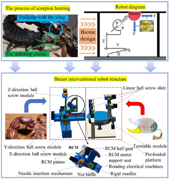 The method of placing the patient prone on a bed and fixing the breast tissue combined with robotic needle insertion is common, but this method still cause damage to healthy tissue and has low intervention accuracy when intervening at the target site in a complex environment. Although tissue deformation can cause the target to shift, by actively manipulating tissue deformation, the target can be transferred to a simple and safe intervention path, thereby improving intervention accuracy. In clinical surgery, the doctor manipulates and fixes the deformation of breast tissue with one hand and inserts the needle with the other hand. Although clinicians are already familiar with methods of actively manipulating breast tissue deformation to shift targets and improve the accuracy of interventional surgery, doctors’ active manipulation of tissue deformation and control of the insertion of interventional needles have problems such as a long target shifting time, low intervention accuracy, and reliance on doctor experience. Bionic technology is increasingly used in the field of minimally invasive medical care. We noted that the scorpion’s predation process is similar to clinical breast interventional surgery. Inspired by the scorpion’s predation process, this paper designs a bionic breast interventional robot that is consistent with the clinical surgical process. The robot can manipulate breast tissue deformation on behalf of doctors, shift the target to the ideal position, and insert the needle, overcoming problems such as the difficulty of target intervention in complex environments, low intervention accuracy, and reliance on doctor experience.