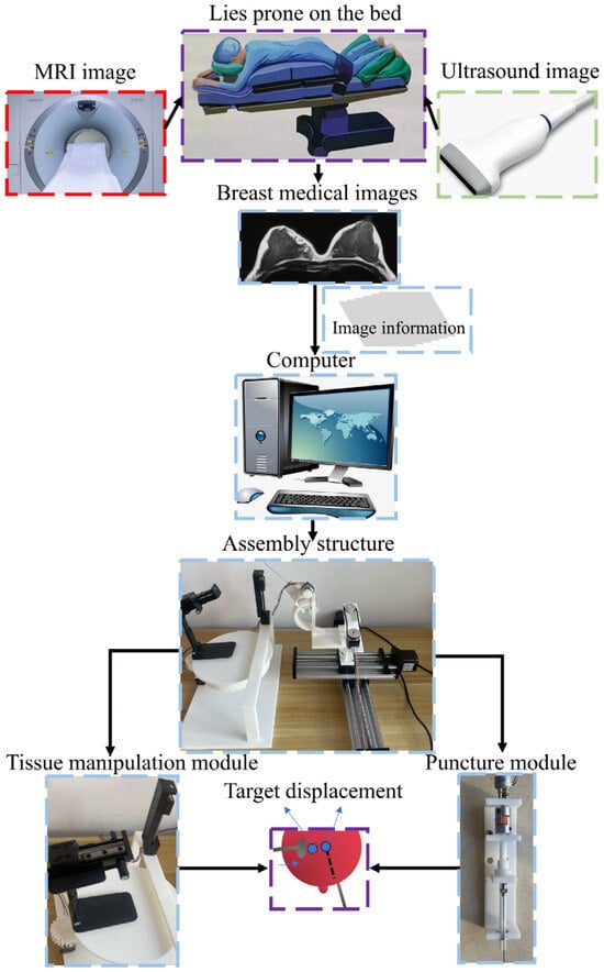 The physical prototype of the robot was made of poly lactic acid (PLA), aluminum, copper, and iron. Since the manipulation of a single breast and two breast tissues has the same meaning, this paper only studied a single breast tissue to verify the feasibility of the theory. The robot’s workflow steps were as follows: First, the patient lies prone on the bed. Second, the medical imaging system determines the position of the target inside the tissue. Then, the data are fed back to the robot through a computer, and the robot begins to manipulate the displacement of the target inside the tissue until it reaches the ideal needle insertion path, stops manipulation, and fixes the tissue. Finally, the robot’s puncture module adjusts the needle’s posture to pierce the target, as shown in Figure 6.