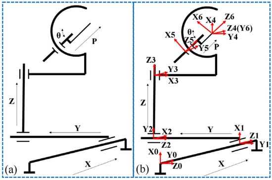 The puncture module had 6 DOFs, and the rotational freedom of the interventional needle did not affect the adjustment of its end attitude. Therefore, the rotational freedom of the interventional needle was not considered at first. A schematic of the puncture module structure is shown in Figure 7a. The simplified robot had five joints and six links. First, a coordinate system was established for the simplified puncture module model. Because the puncture module had five joints, six coordinate systems had to be established: the coordinate system of the base of the puncture module was {0}, and the coordinate system on the corresponding connecting rod i was {i} (i: 0–6). The joint coordinate system of the puncture module is illustrated in Figure 7b.