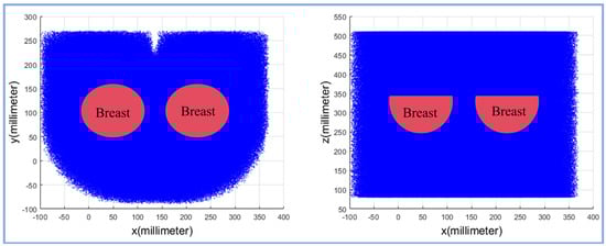 Based on the actual measurement of the mechanism model, we obtained the known parameters and used MATLAB (2019-b) to solve the workspace. The results are shown in Figure 8. The left and right figures show the projection of the breast on the xoz plane and the xoy plane, respectively. The blue area indicates the spatial position that the needle tip of the puncture module can reach. It can be seen from the figure that the needle tip of the puncture module can completely cover the operating range of the breast on the xoy plane, and at the same time, on the xoz plane, the workspace is large enough to meet the thickness requirements of the breast. This ensures that the needle tip can accurately cover all areas of the breast and meet the high requirements for the needle tip position during the operation, thereby improving the accuracy of the puncture and the flexibility of the operation.