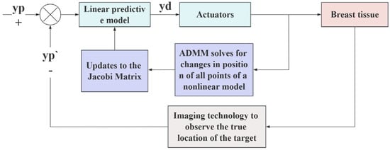 The signal is transmitted to the actuator and acts on the breast tissue. At the same time, the displacement of the control point is introduced into the tissue dynamics model obtained in Section 3.4 to solve the updated model. The new Jacobian matrix is used to update the linear prediction model and combined with image technology to confirm the actual target position and feedback to the system. The system re-solves the model until the error approaches zero. Figure 10 shows the speed control block diagram of the actuator displacement control, and its formula is as follows