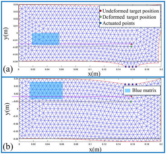 In order to verify the feasibility of the theory in Section 3, the tissue manipulation method was first simulated using MATLAB (2019-b) software and the simulation results were visualized. First, the two upper and lower two targets were defined under a 2D rectangle. The 2D breast tissue was modeled and meshed using Matlab’s PDE toolbox, and the meshed 2D breast tissue was considered as a rectangle in this section. Programming was performed using MATLAB for the computation on a Windows 10 computer with an Intel(R) Core(TM) i3-9100F CPU @ 3.60 GHz and 16 GB of running memory. When the positions of the control and target points were confirmed, tissue deformation was simulated, and the visualization results are shown in Figure 11. Figure 11a shows that when the target and other important organs were located inside a two-dimensional rectangular tissue, the manipulation point was displaced by applying a force perpendicular to the long side of the rectangle to pull the tissue downward, thereby allowing for a simple and ideal intervention path without obstacles. Figure 11b similarly demonstrates a simple intervention path by applying a force perpendicular to the long side of the rectangle to push the tissue downward. This simulation verified the displacement relationship between the manipulation point and the target pushed from Section 3 and achieved the manipulation of the target inside the tissue by pushing and pulling. To clearly describe the situation before and after tissue deformation, the needle path before undeformed tissue manipulation is represented as a purple rectangle, with the red point as the undeformed target point, and the blue semi-transparent matrix as the nerves, blood vessels, and other tissues inside the breast tissue. When the desired displacement position of the target was known, the desired displacement position of the target was entered to start tissue manipulation. The gray rectangle indicates the needle path after tissue manipulation and the green dots indicate the target position after tissue deformation. The results of this simulation clearly demonstrated that the tissue could be manipulated and deformed to displace the target at the desired position.