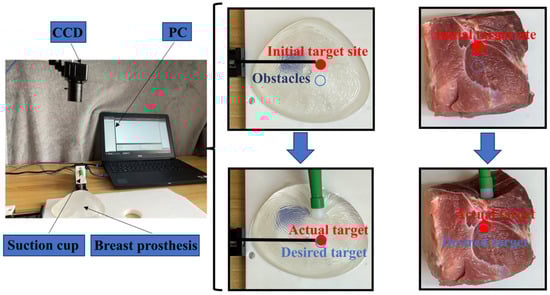 Subsequently, we conducted experiments on the breast prosthesis and in vitro tissue to verify that the error between the final actual position of the target point and the desired position was within the allowable range. The breast prosthesis needed for the experiments consisted of artificial silicone, which was chosen to allow the observation of the target point movement, and the elastic modulus of the breast prosthesis was determined to be 10 kPa [27]. The in vitro tissue required for the experiment was obtained from pork. A tissue manipulation experimental platform was mounted, and the breast prosthesis and in vitro tissues were fixed on the platform using a ball screw to drive the suction cup to manipulate the breast prosthesis and in vitro tissues, and another ball screw to drive the interventional needle to realize the puncture of the target point. The transparent prosthesis was fixed on the platform, and blue and black objects were placed inside the prosthesis, with the black object simulating the internal target site and the blue object simulating the vital tissue. The blue circles marked the desired target position, and the red circles marked the actual target position. The error between the deformed target position and desired target position was calculated by pushing the breast prosthesis through an external actuator. Similarly, the in vitro tissue was fixed on the platform to calibrate the desired target point position, and the target point was placed inside the in vitro tissue using a peg, with the peg inside the in vitro tissue and the head of the peg on the surface of the in vitro tissue to observe the displacement. Experiments were conducted on the breast prosthesis and in vitro tissue separately, and a CCD camera was used to observe the target point displacements in different experiments, as shown in Figure 13.