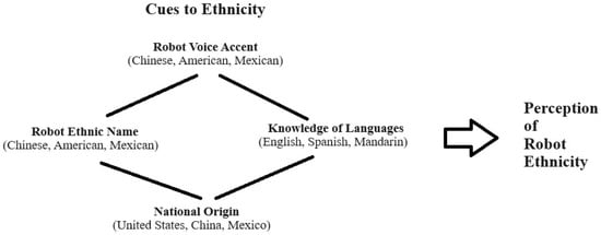 From the above introductory comments, based on content provided in a robot’s spoken communication, the perceived ethnicity of a robot can be an important factor in determining how users evaluate robots, whether they express positive or negative biases toward the robot, and whether they perceive the robot as supporting their values and interests during HRI. To investigate robot ethnicity in the context of HRI, the approach taken in the current research is to use cues to ethnicity delivered to the user through a conversational narrative spoken by the robot. While there is an existing stream of research on the classification of robots by cues signaling the robot’s gender [26,27], relatively little research has been done to determine which social cues may signal the impression of robot ethnicity. To help fill this gap in the literature, the current study was run to investigate how cues to ethnicity expressed in a robot’s spoken narrative influenced whether the robot was perceived to have a Chinese, American, or Mexican ethnic identity. Further, the research was designed to extend the results of past research by Eyssel and Kuchenbrandt [10] who evaluated the impressions formed of a robot presenting with a German or Turkish identity but in the current study extended to include three different robot ethnic identities based on the social cues presented in the robot’s spoken narrative.