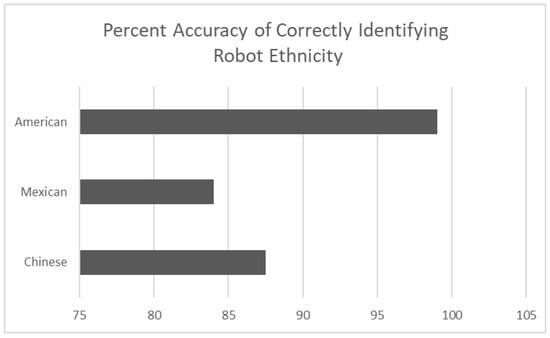 The above results are shown graphically in the following three figures. To start, based on the cues used to create a robot ethnicity manipulated in the current study Figure 3 shows that the American ethnicity was accurately identified most often, followed by the Chinese and Mexican robot ethnicities. The range in accuracy was between 84% to 99%. From this, given the participants used in the study, it is tentatively concluded that the cues signaling a non-American ethnicity were less effective in signaling a robot ethnic identity a point which will be discussed in more detail below.