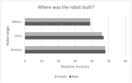 Figure 4 shows the accuracy of identifying the origin of Misty II as presented in the robot’s spoken narrative for both male and female robots. Recall that the place of origin was stated as Mexico, China, or the United States. Also note that responses are very similar across the participant’s gender. However, identifying the origin of the robot as being from the United States was highly accurate (100%), followed by China (97%), and lastly Mexico (81%). Interestingly, even if the origin of the robot was stated as Mexico there was a tendency for the robot to be selected by the participants as having an origin from the United States. Recall that Trovato et al. [45] proposed the idea of cultural closeness in which entities with perceived cultures thought to be similar to that of the observer were preferred over more dissimilar cultures. In the current study it is possible that the cultures of the United States and Mexico were thought by participants to be similar due to the influx of Hispanic immigrants to the United States and thus the robot presenting with a Mexican identity was sometimes given an American ethnic identity. Additional studies should be done to further explore this conjecture.