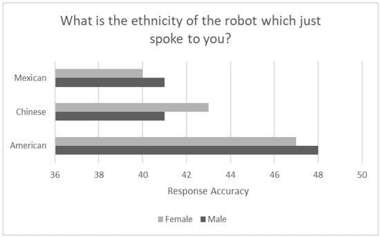 Figure 5 shows the accuracy of identifying the ethnicity of the robot based on whether the voice spoken was presented as male or female. Examining Figure 5, overall, participants were more accurate identifying the robot presented with an American ethnicity and least accurate identifying the ethnicity of the robot presented with a Mexican ethnicity. As with the above figures, the trend in the data is for higher levels of accuracy associated with the American ethnic robot, followed by the Chinese, and lastly, Mexican ethnic robot. Interestingly, the accuracy of correctly identifying that the robot had a Chinese or Mexican ethnic identity was very similar when the voice was presented as male. The Chi-Square test of independence was performed on the frequency data for incorrect responses shown in Table 1. The results support the above findings for the accuracy of correctly identifying robot ethnicity in that there were 12 errors identifying the Chinese ethnic robot, one error identifying the origin of the robot as American, with 15 errors produced identifying the robot ethnicity when the cues signaled a Mexican ethnic identity. Further, recalling the name of the robot stated in the spoken narrative was less accurate than identifying the robots origin or accent, with 19 errors produced for the Chinese ethnic robot, 9 errors for the American robot, and 11 errors for the Mexican ethnic robot.