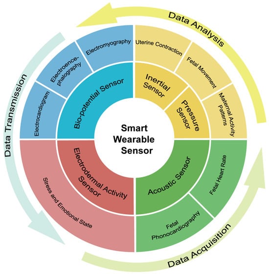 The common types of pregnancy-monitoring wearable sensors are shown in Figure 2. They are classified into five categories based on the measurement parameters and mechanisms. Bio-potential sensors are based on changes in electrical potential, aiming at directly measurable electrical signals, e.g., ECG. Pressure and inertial sensors are based on physical movement, mainly targeting the movement of the mother and the fetus during pregnancy, e.g., FM. Acoustic sensors are based on the acquisition and separation of sound, mainly measuring regular acoustic signals, e.g., FHR. Electrodermal sensors, a relatively new research direction, analyze the composition of liquids to confirm physiological parameters. They are mainly suitable for measuring stress and emotional states, and their use in pregnancy monitoring needs to be further explored. All of the above sensors can be integrated into multimodal smart wearable devices. The acquired signals are then transmitted and analyzed to get the result. AI algorithms revolutionize the traditional approach to pregnancy monitoring by offering real-time analysis of vital signs, FM, and maternal health indicators. These sophisticated algorithms provide early detection of potential complications, such as preeclampsia, allowing for timely interventions to safeguard both maternal and fetal health [,]. With the convenience of remote monitoring through wearable devices and mobile apps, AI empowers pregnant women with continuous access to personalized care, reducing the need for frequent clinic visits []. This application also facilitates the collection and management of different physiological states of pregnant women, providing them with personalized medical advice and treatment plans. With a wide range of sensors and algorithms emerging, a clear understanding of wearable sensors, data-processing algorithms, and applications of AI in maternal health monitoring is essential.