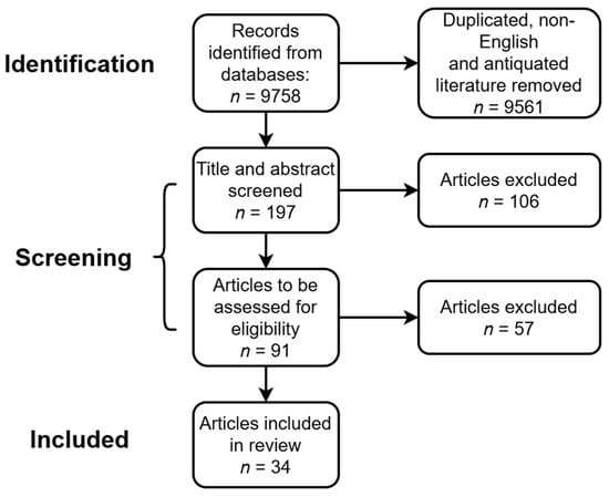 As shown in Figure 3, after removing duplicates, non-English, and antiquated literature, a total of 197 articles were identified from databases. Among them, 91 articles were selected based on title and abstract screening. Finally, 34 articles were selected to be eligible.